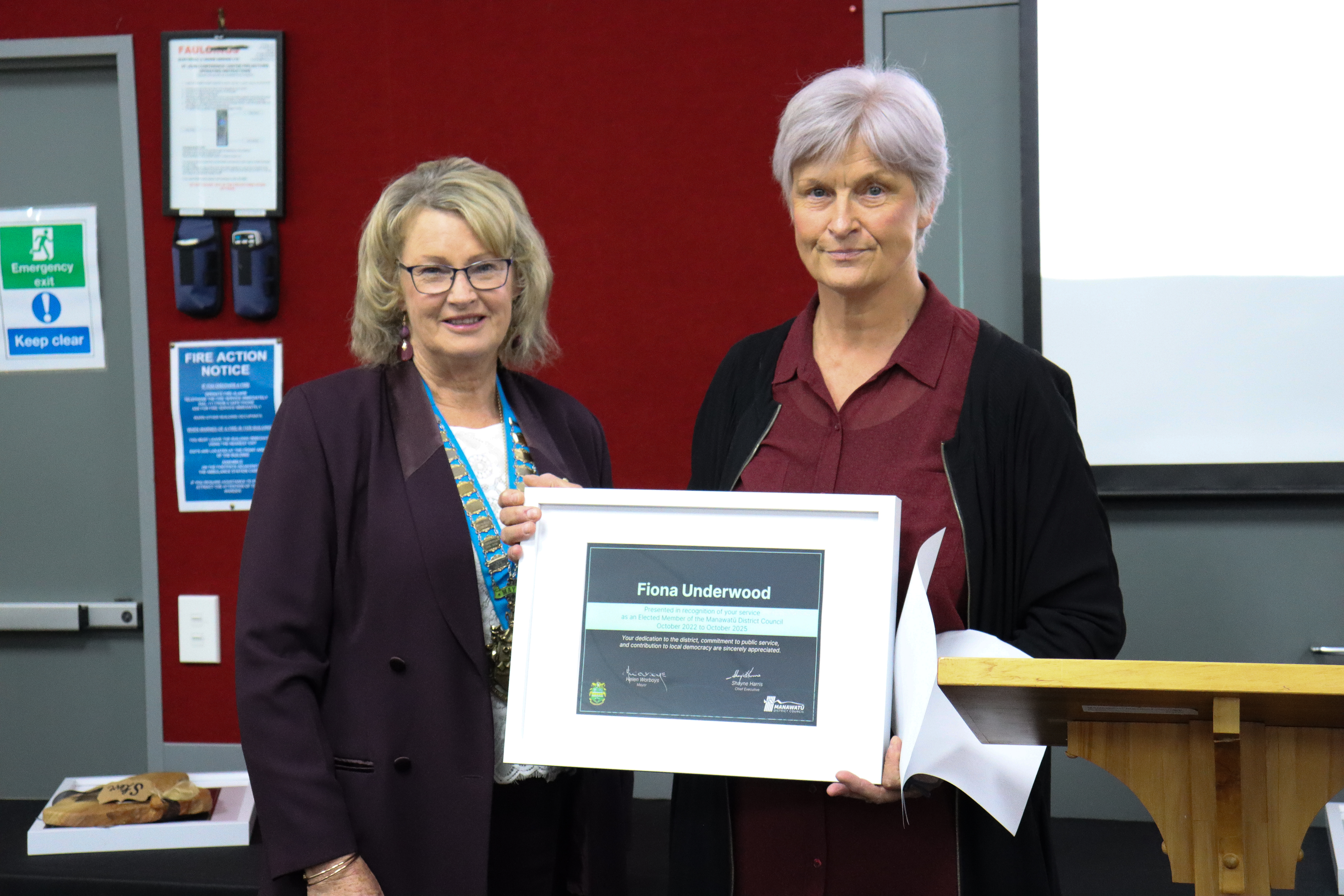 Cr Fiona Underwood with Mayor Helen Worboys at the final Council meeting.