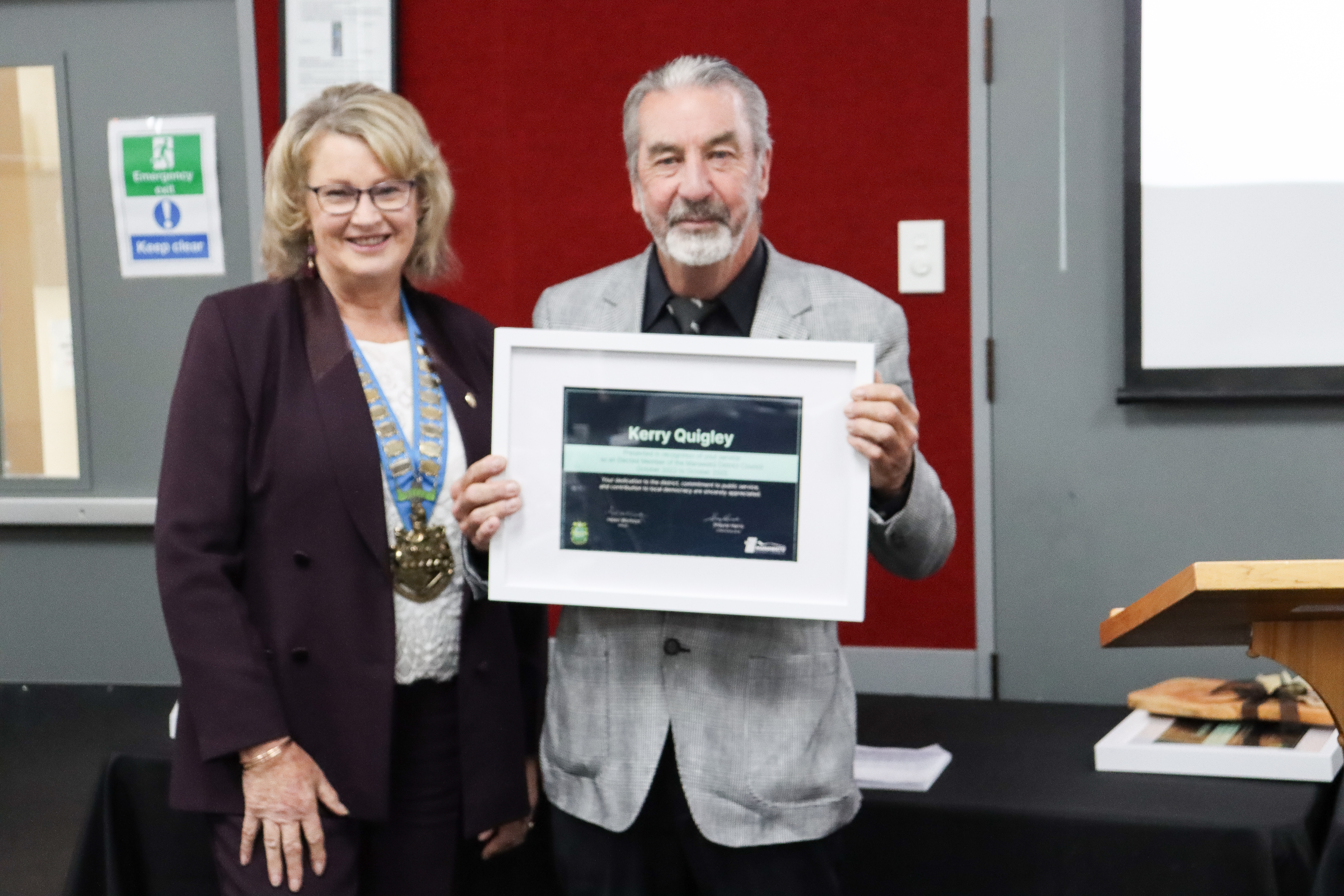 Cr Stuart Campbell with Mayor Helen Worboys at the final Council meeting.