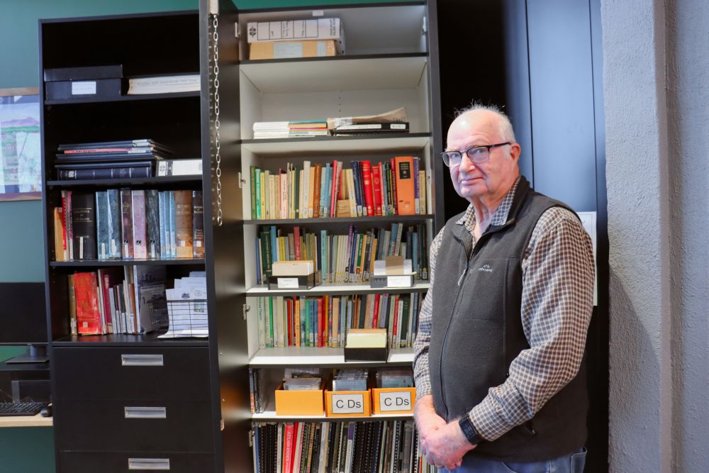 NZSG Feilding Branch Convenor Ian Wightman with the genealogy archives at Te Āhuru Mōwai, where local history is carefully preserved.