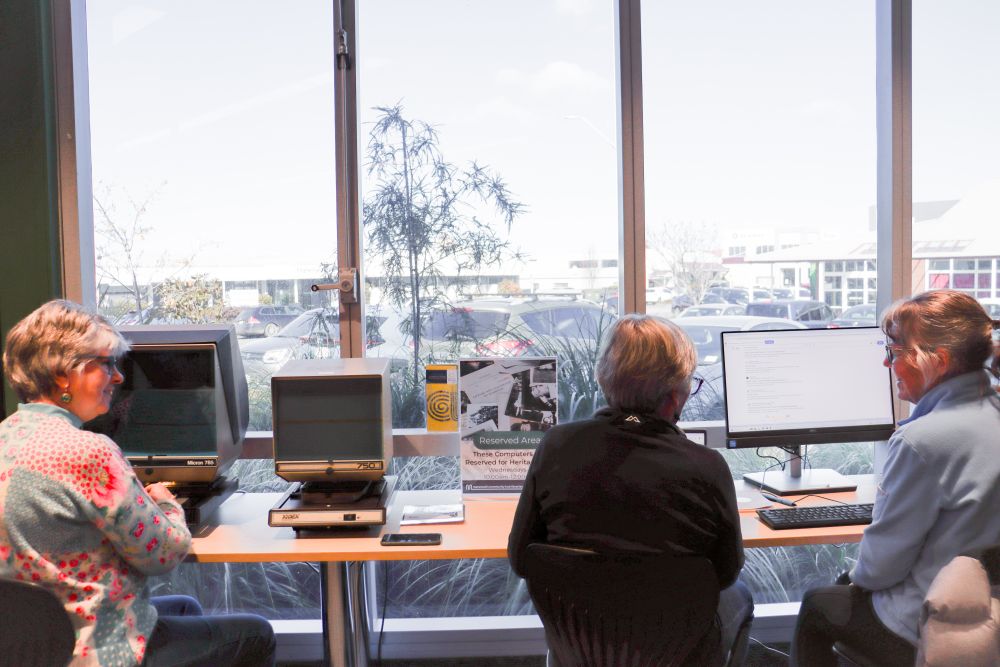 Microfiche machine on the left being used by NZSG Feilding Branch Librarian Janet Doyle and computers are also available for research in the heritage space.