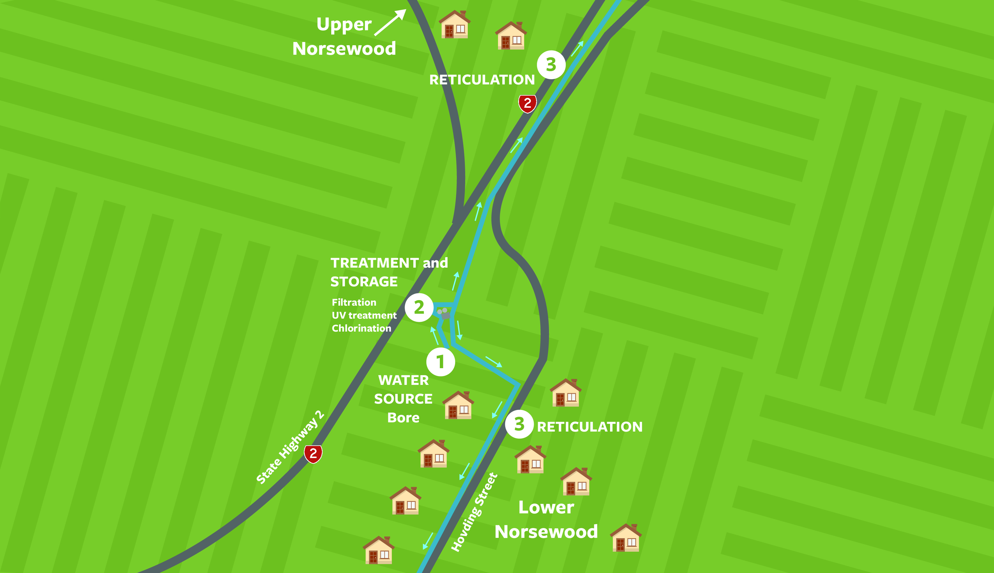 The Norsewood water supply covers the urban area and outskirts of Norsewood.